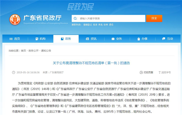 2019年5月16日,广东省民政厅官网公布广东省需清理整治的不规范地名清单(第一批)。通告指出,为进一步加强和规范广东省地名管理,清理整治居民区、大型建筑物、道路、街巷等地名中违反《地名管理条例》 《地名管理条例实施细则》 《广东省地名管理条例》和《广东省建筑物住宅区名称管理规定》的“大、洋、怪、重”不规范地名,经各相关市直有关部门排查、论证,认定了第一批251个不规范地名,包括广州、珠海、汕头、惠州、云浮5个城市。
