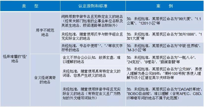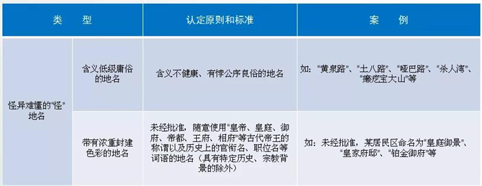 刻意夸大地域、规模、功能的“大”地名,包含外国人名、地名、外语词的“洋”地名,用字不规范、怪异难懂的“怪”地名,重名同音的“重”地名,这些都算。还有一些道路、街巷修建多年后仍没有标准名称,这样的就叫“有地无名”。此外,一地多名、一名多写也是不规范的。
